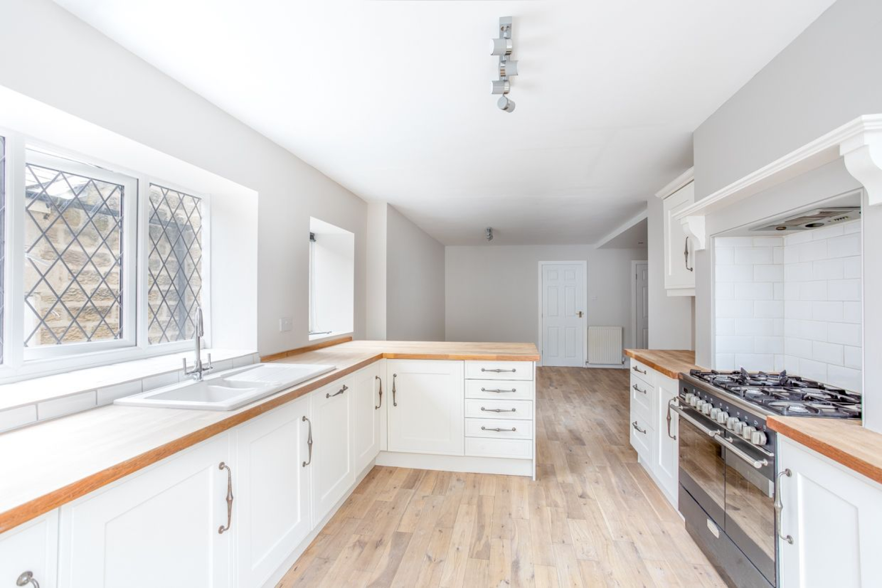 A range of wall and base units with wood working surfaces having inset ceramic 1.5 sink. Gas range cooker with extractor fan above and tiled splash backs. Integrated dishwasher and space for fridge freezer. Breakfast base with space for stools. Double glazed windows to the side. Central heating radiator.