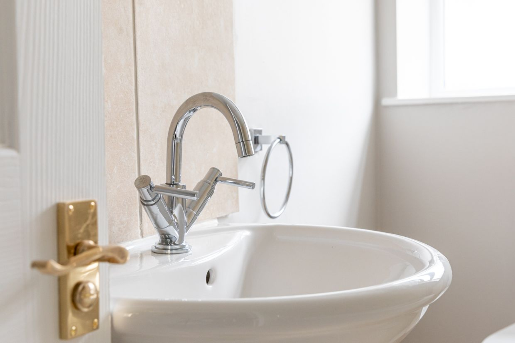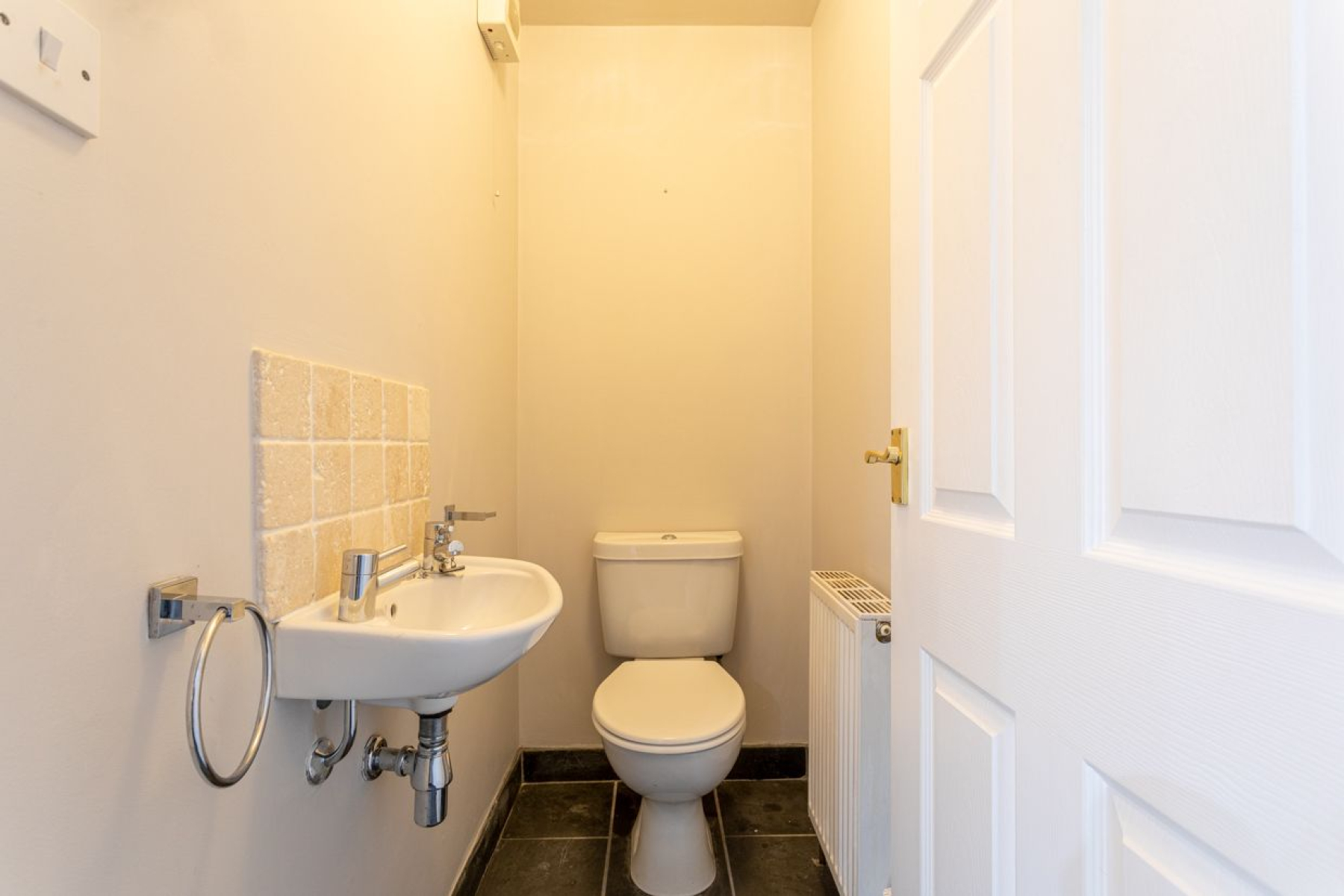 Low flush wc, wall mounted wash hand basin with tiled splash back and central heating radiator. Plumbing and space for washing machine.
