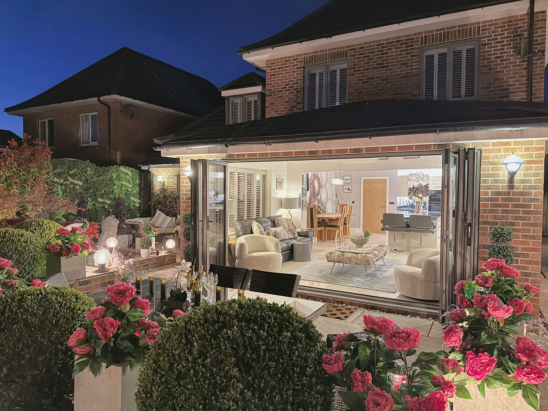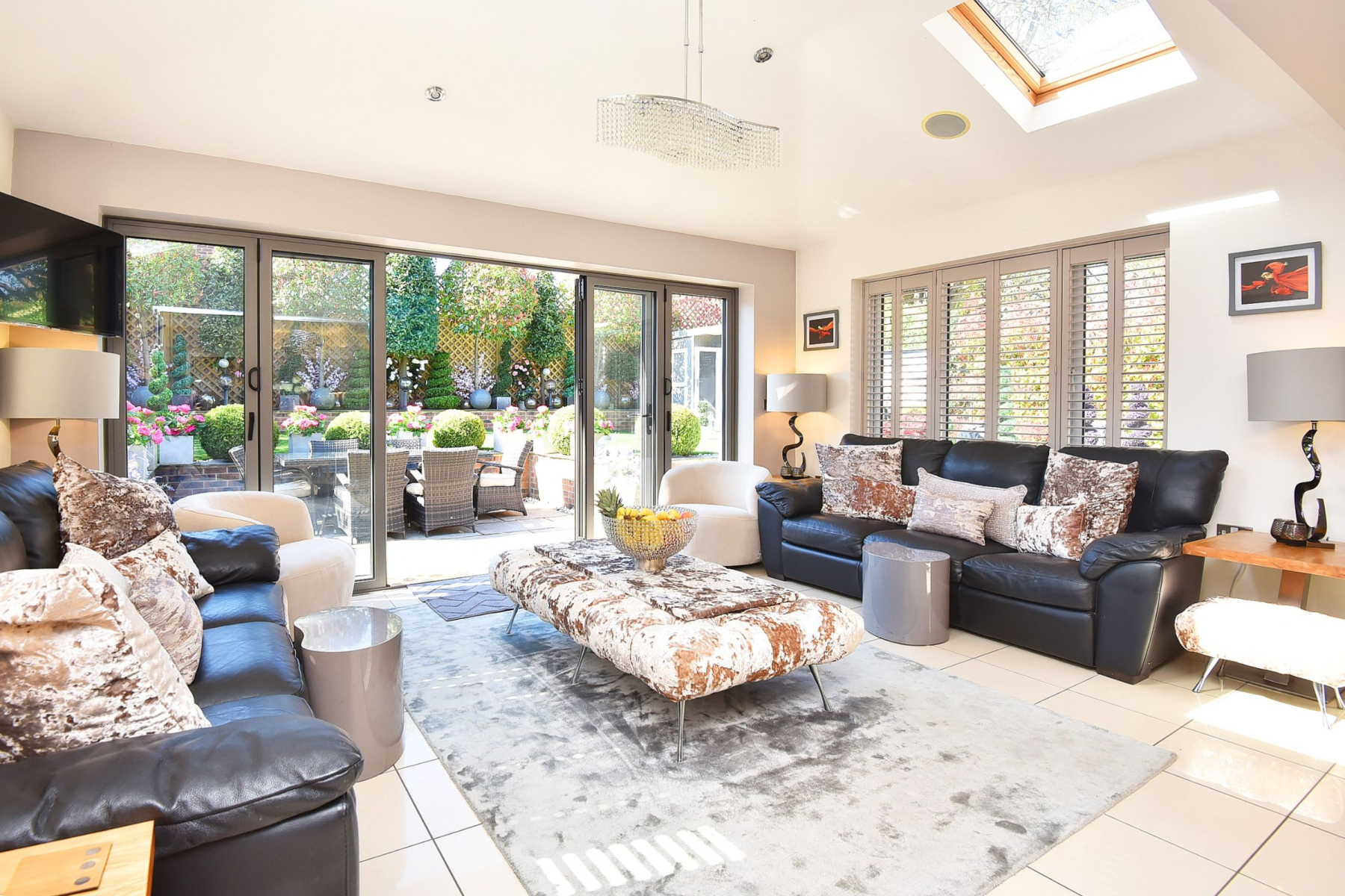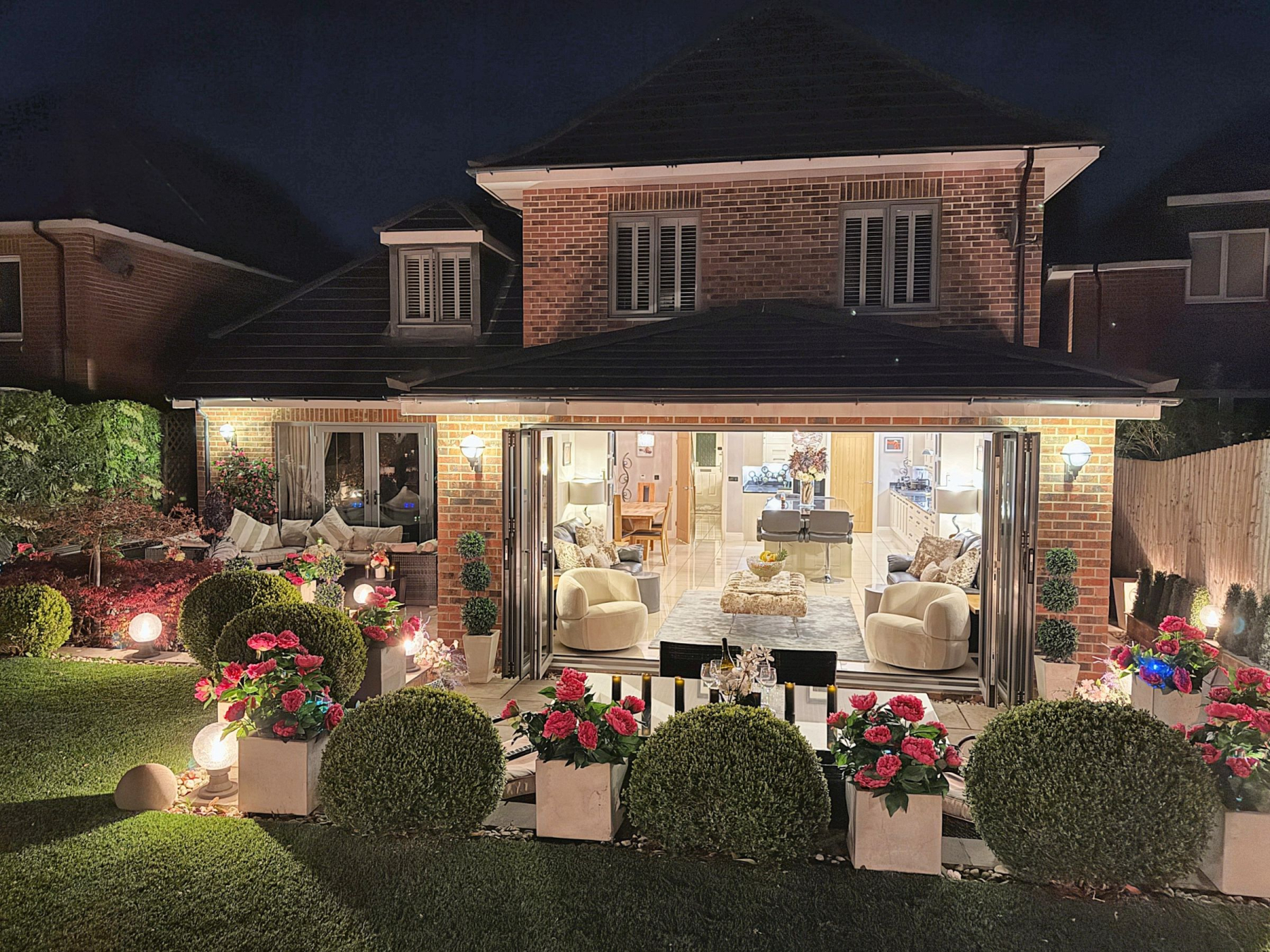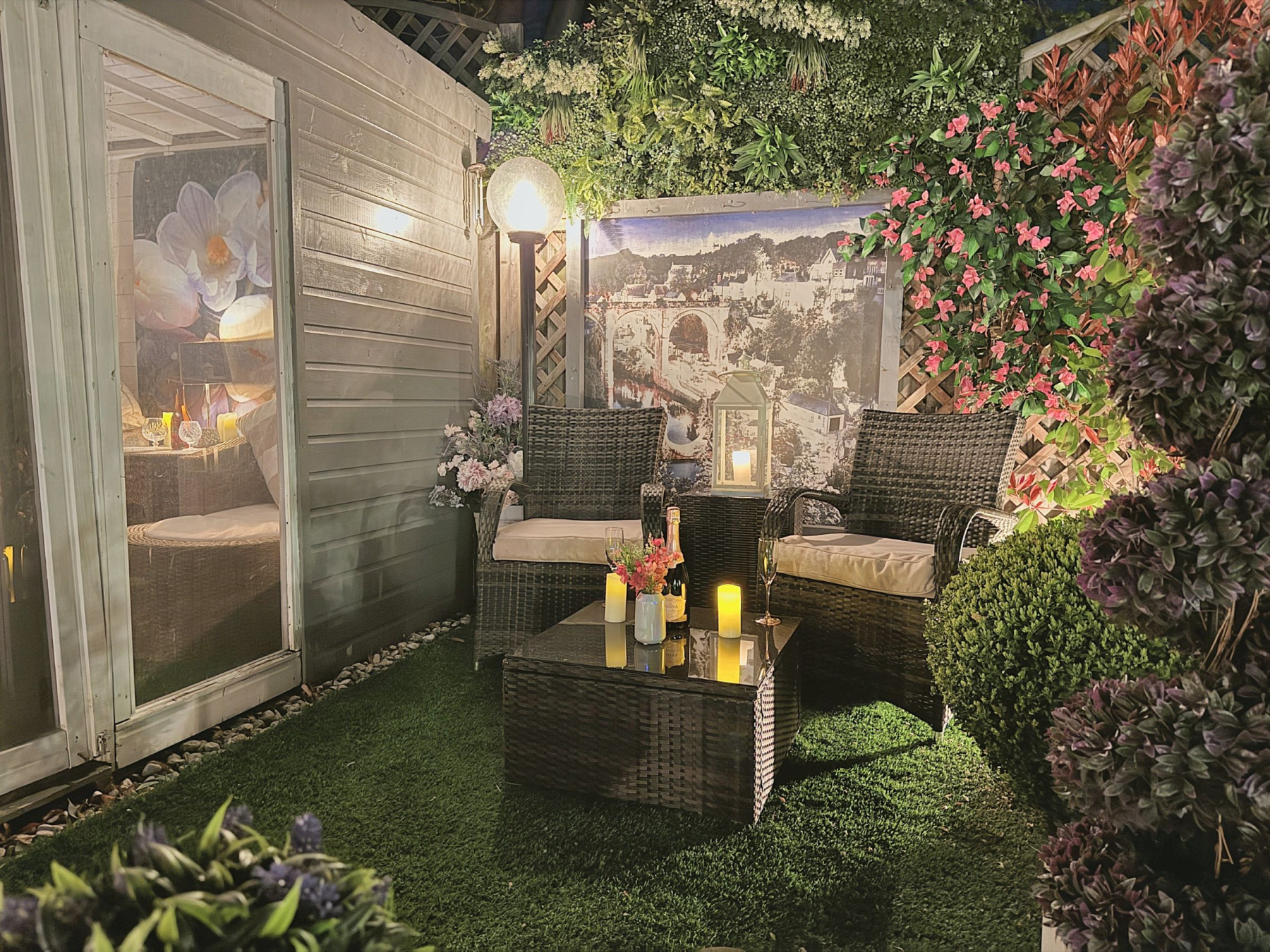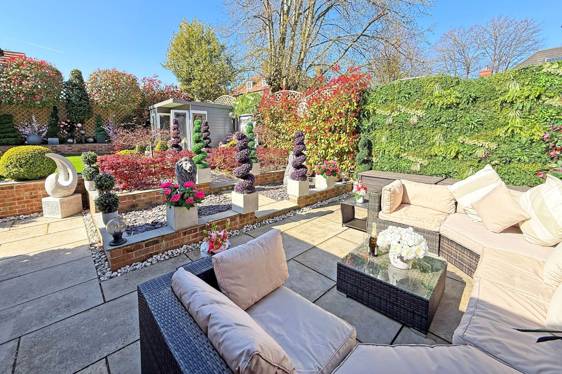 To the rear there is a private and enclosed south facing garden carefully landscaped to create a sense of intimacy, maximising the flow between inside and outside with astro turf lawn and multiple seating/entertaining areas including a summer house which has power.