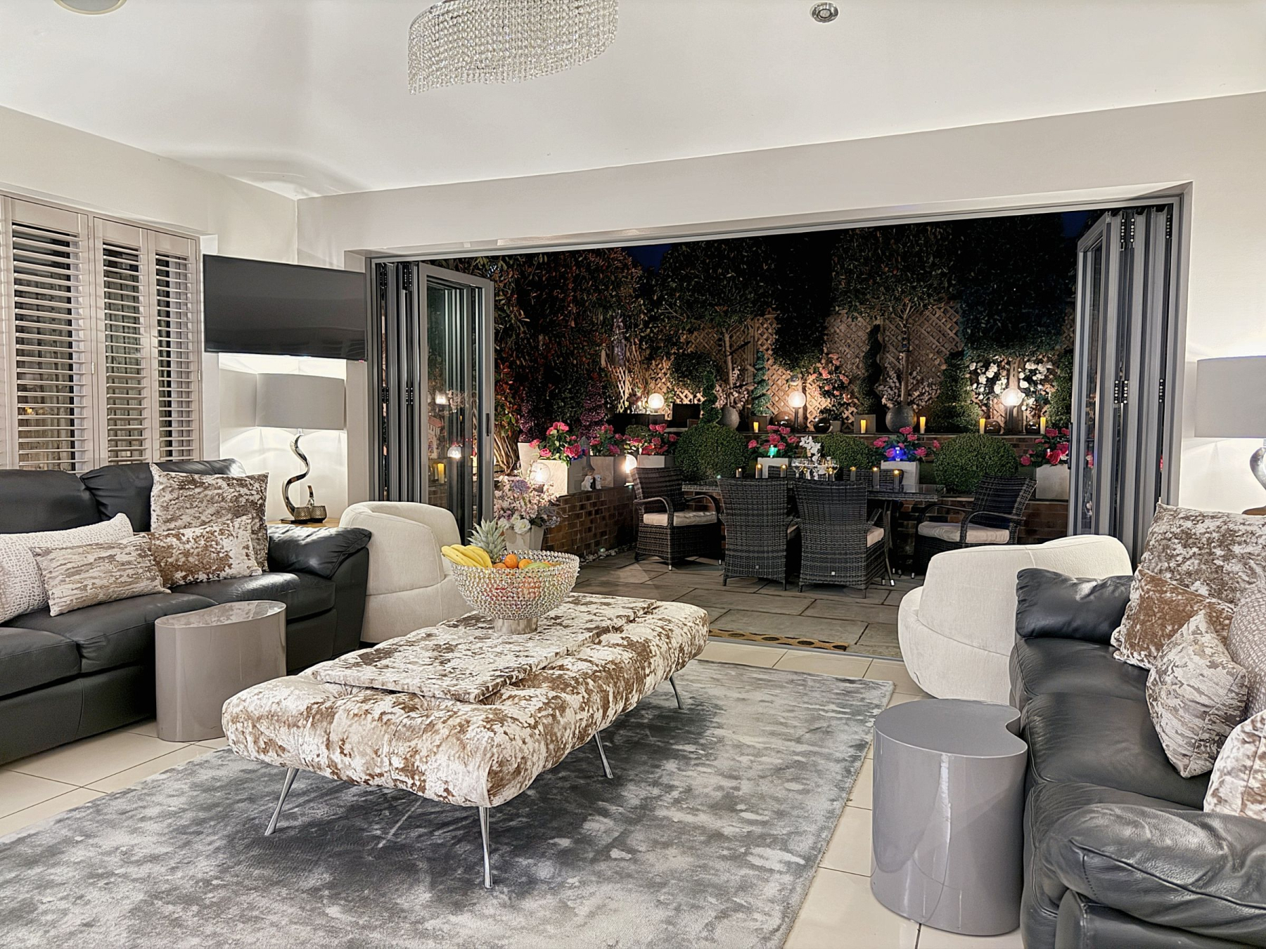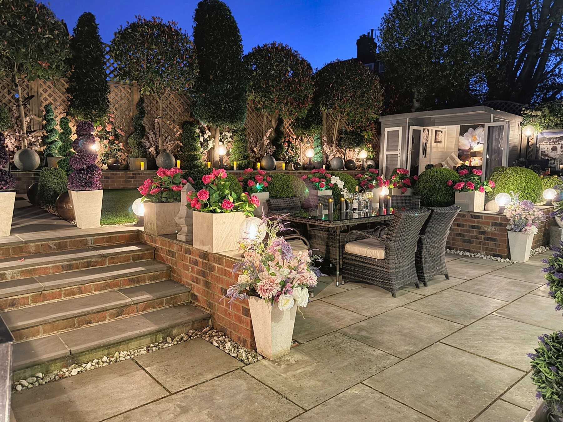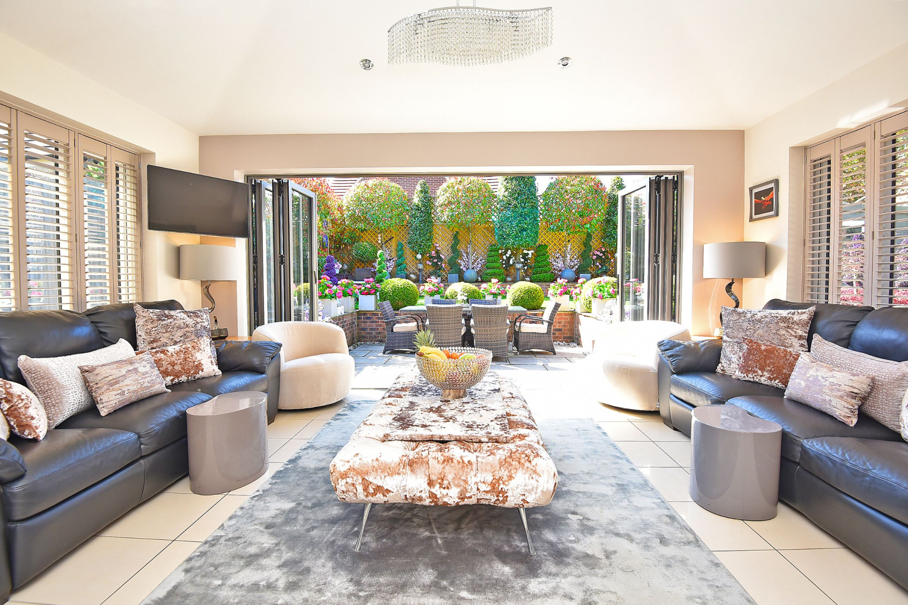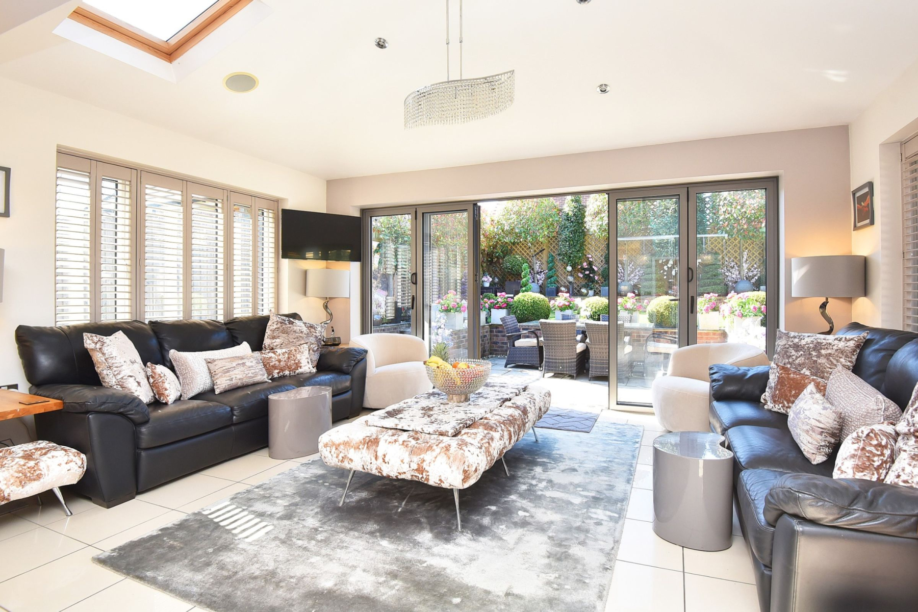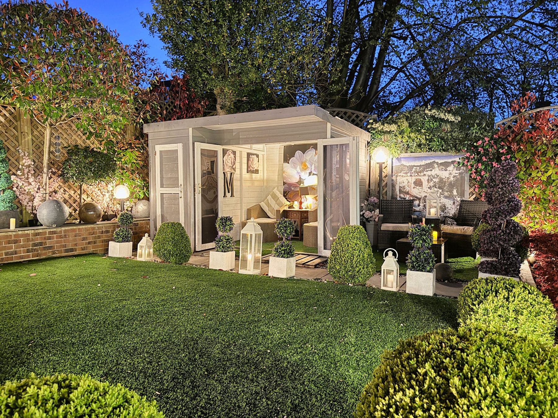To the rear there is a private and enclosed south facing garden carefully landscaped to create a sense of intimacy, maximising the flow between inside and outside with astro turf lawn and multiple seating/entertaining areas including a summer house which has power.
