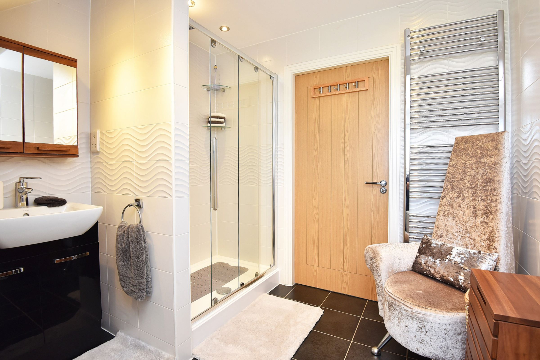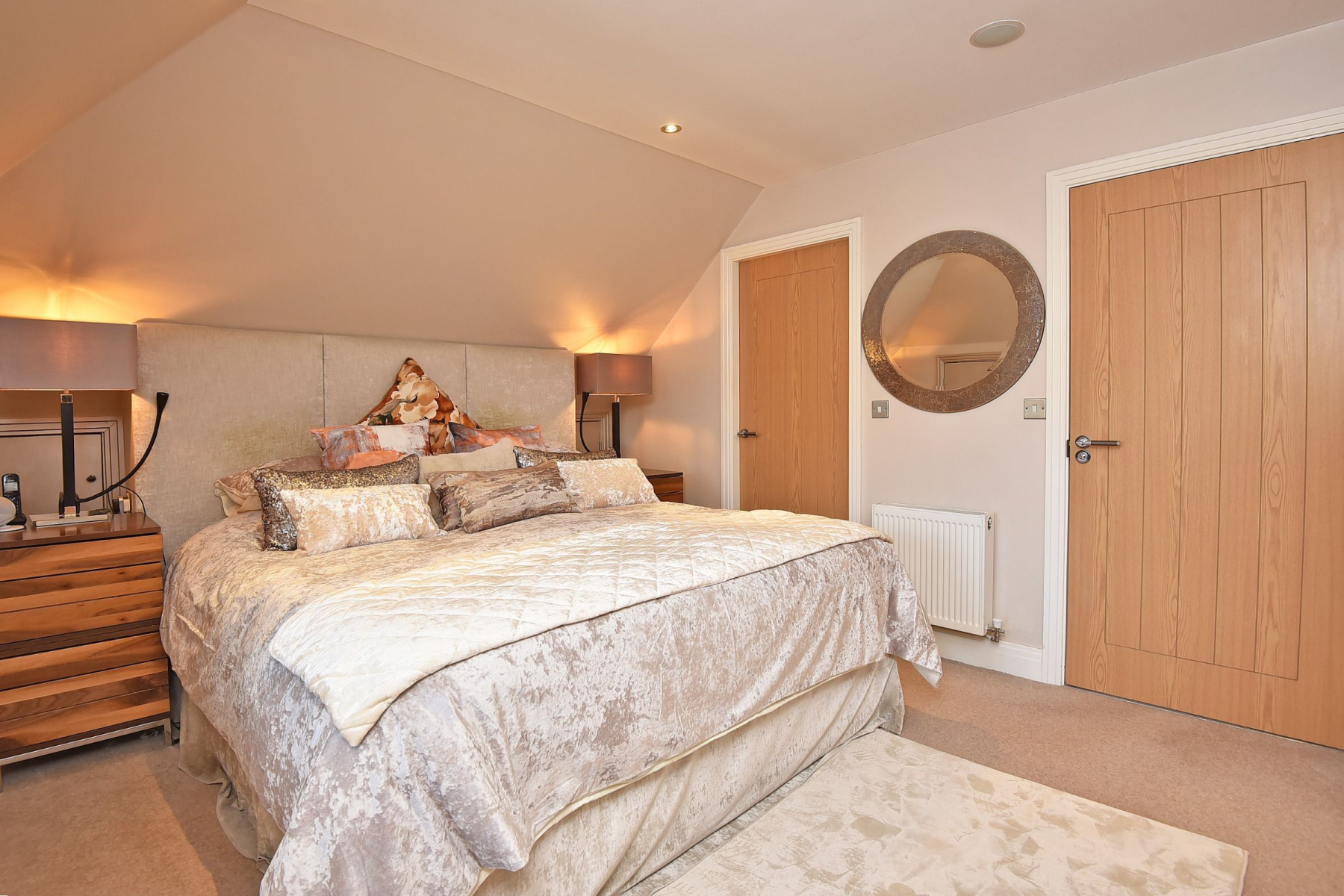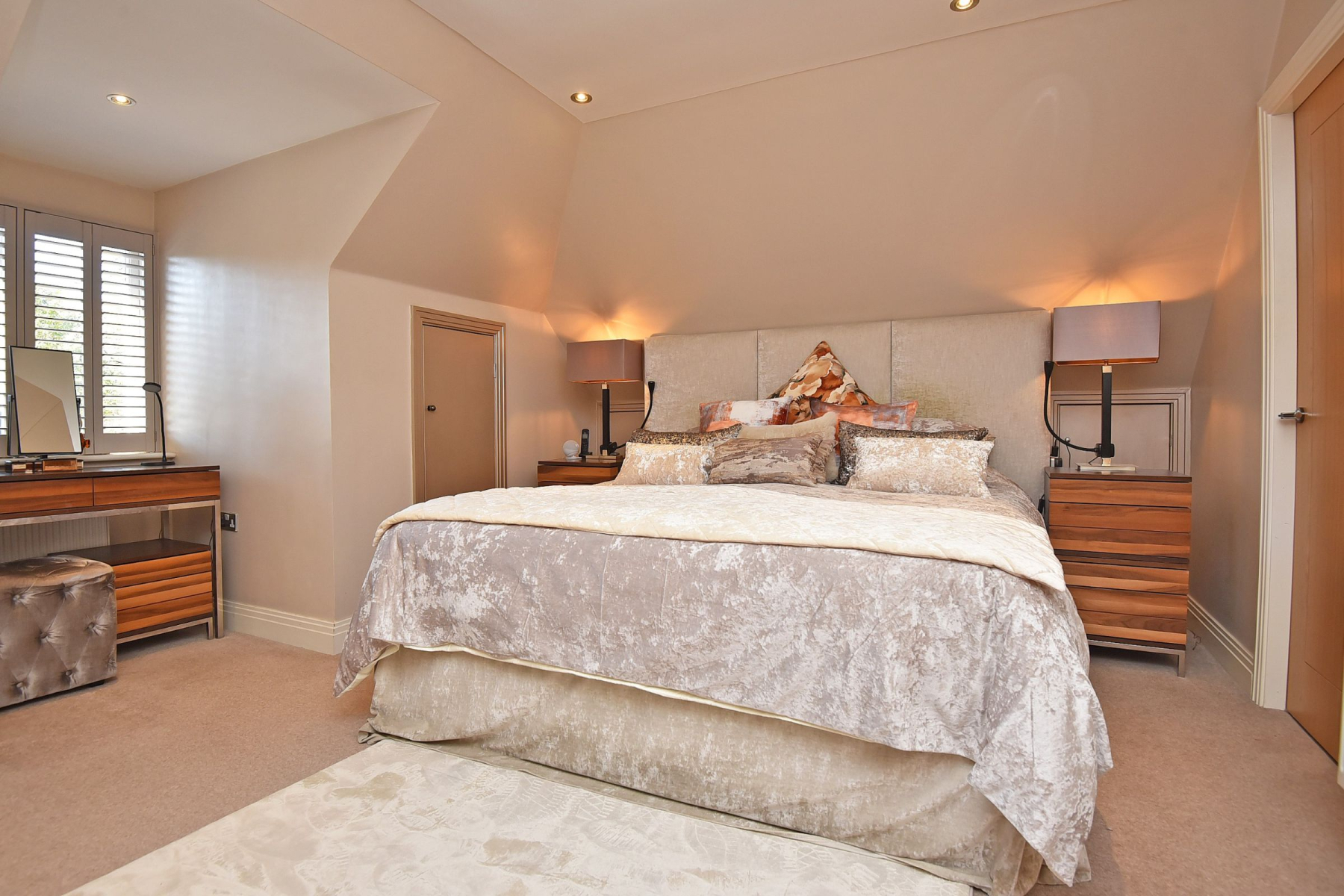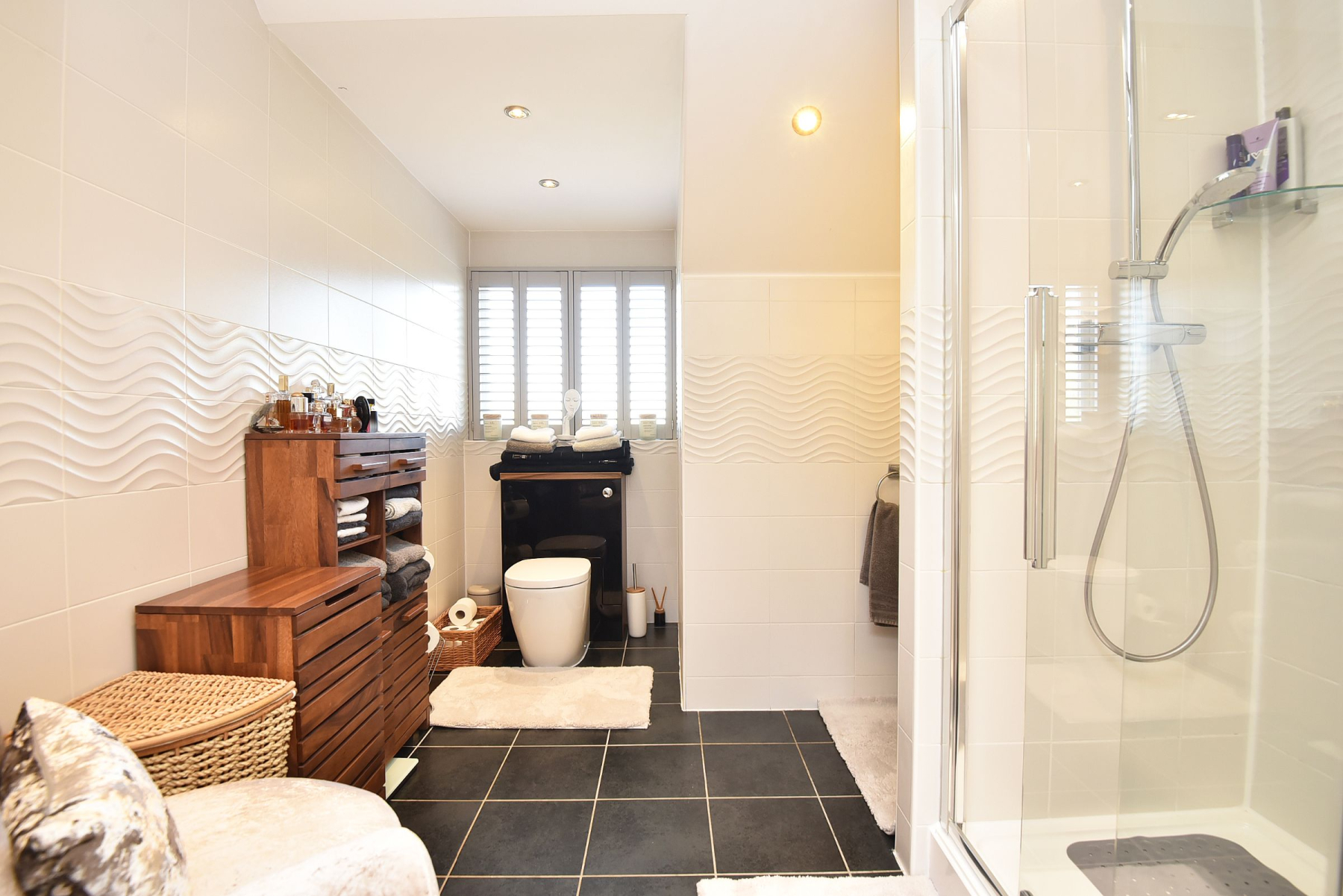To the first floor, the landing leads to the Master bedroom suite with walk-in dressing room and ensuite shower room with walk in shower, w/c and hand basin. Second double bedroom with walk in wardrobe and ensuite shower room with large walk in shower, w/c and hand basin. There are two further double bedrooms one including a built in wardrobe and a fantastic modern house bathroom with walk in shower, separate bath, w/c and hand basin with vanity unit offering useful storage. There is additional storage in the eaves from the Master bedroom and in the loft space.