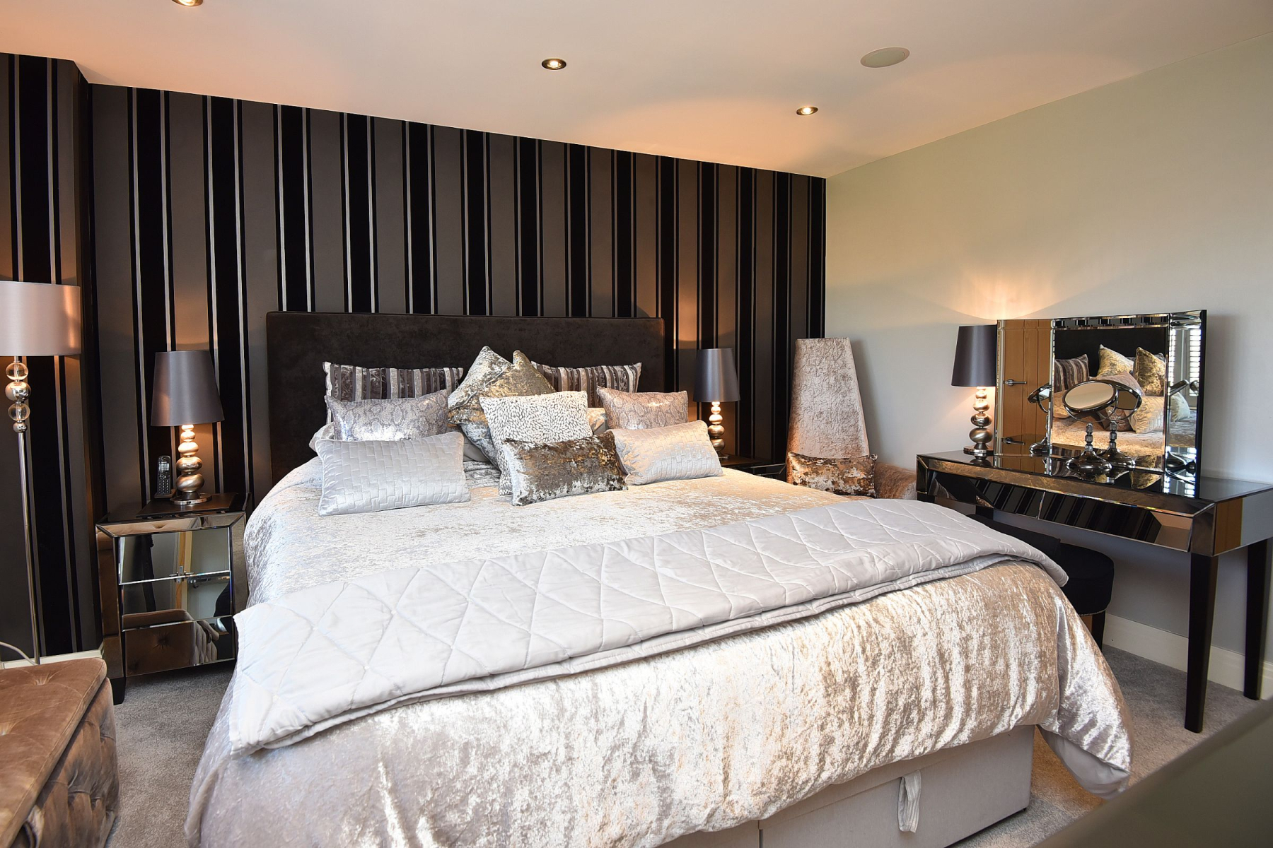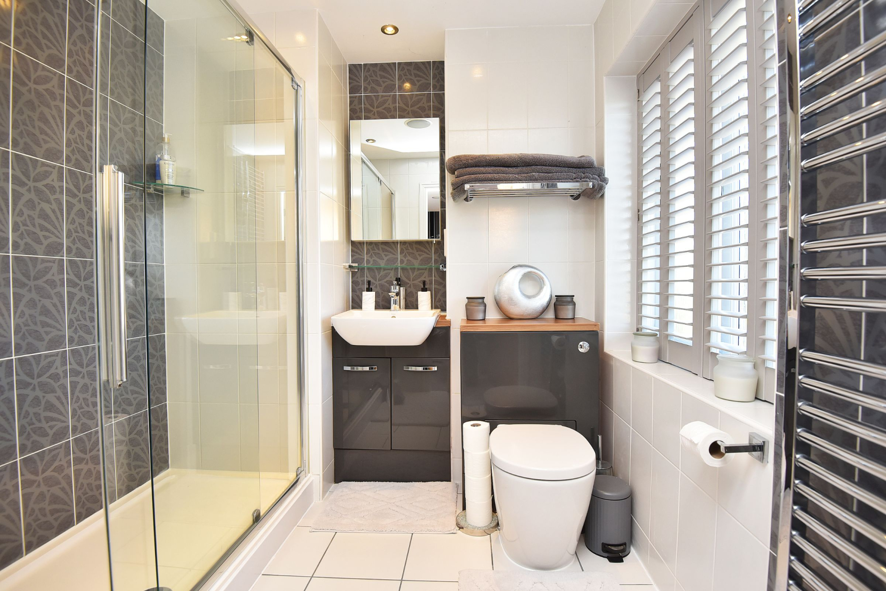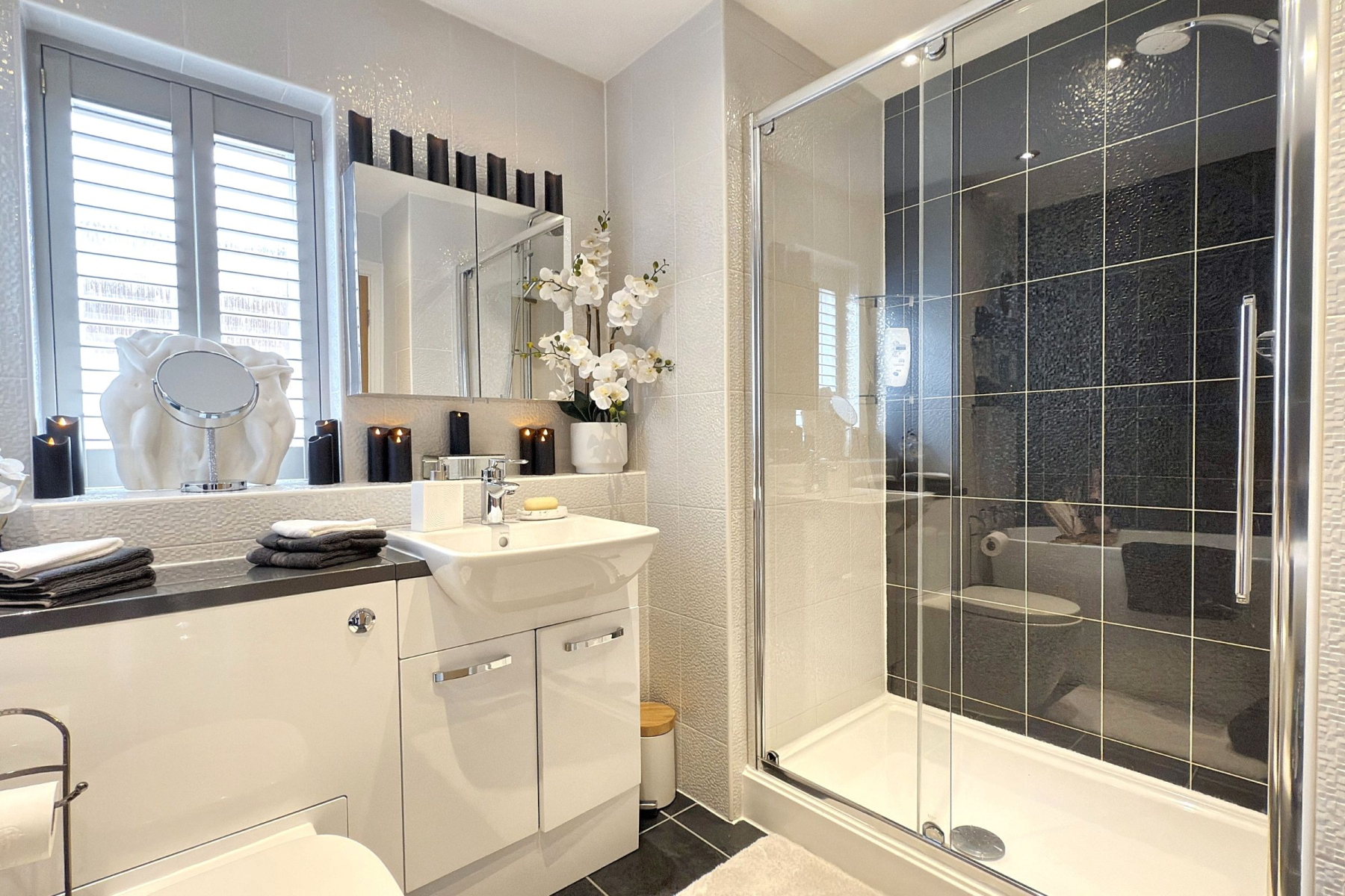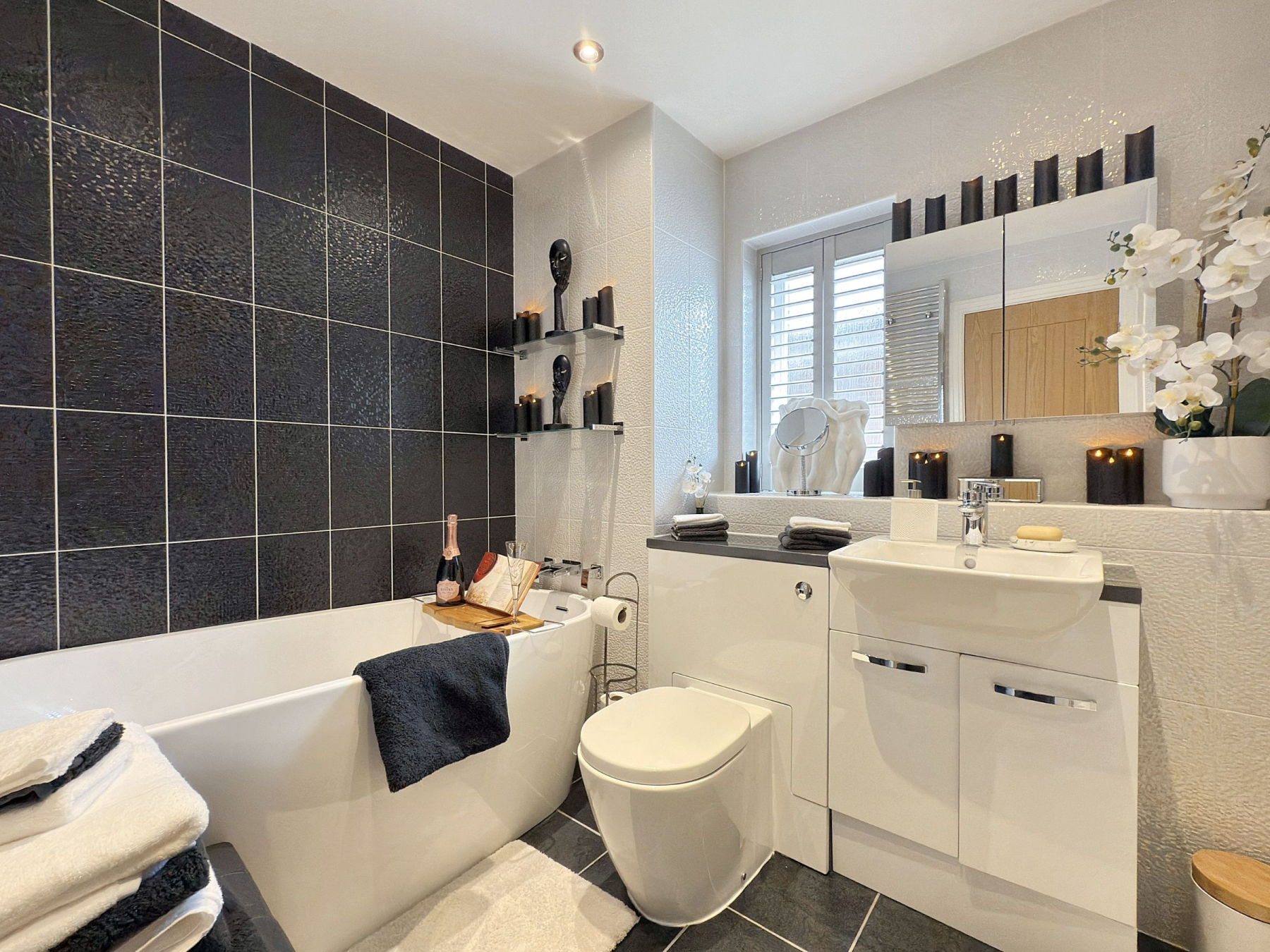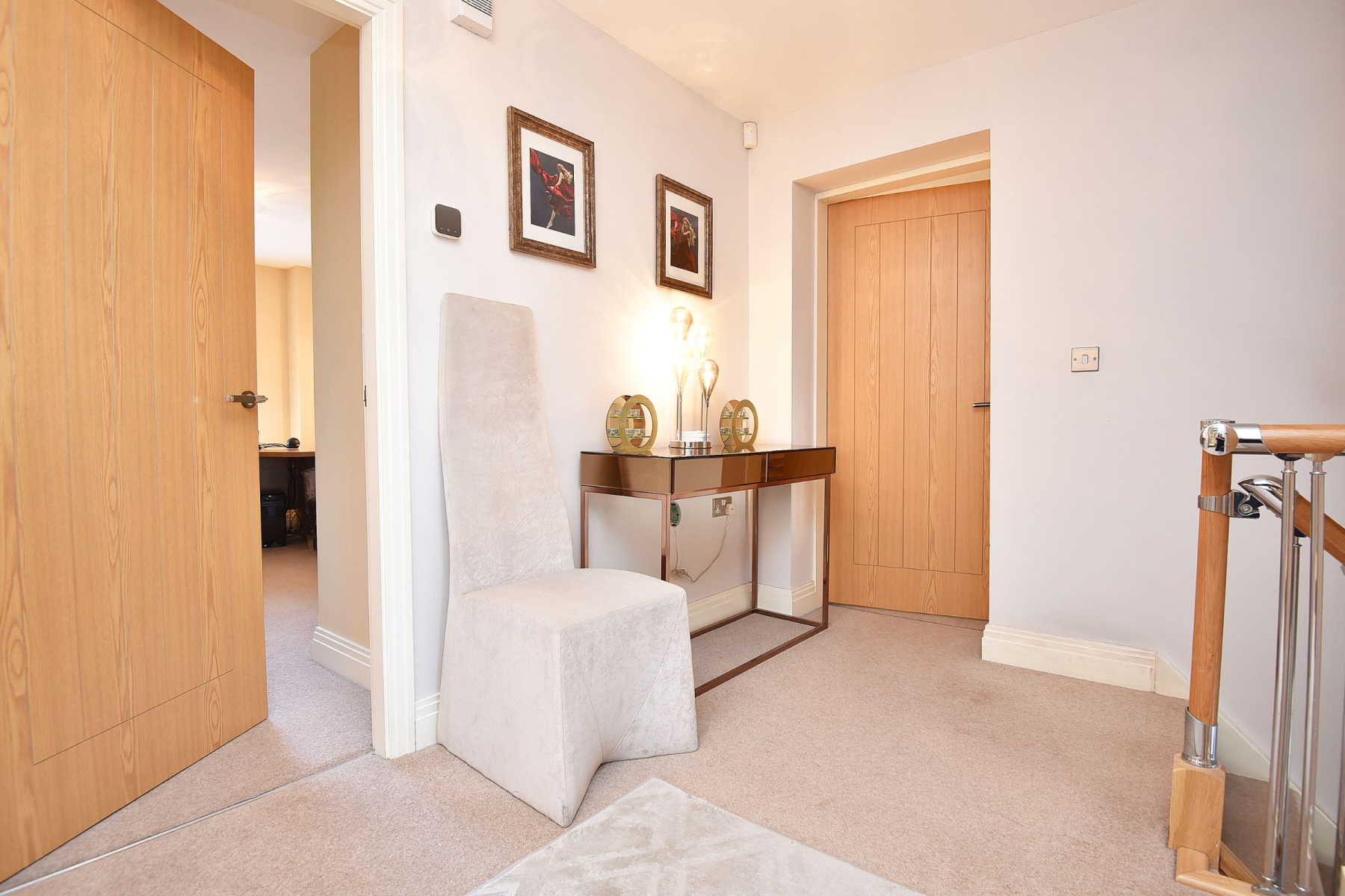 To the first floor, the landing leads to the Master bedroom suite with walk-in dressing room and ensuite shower room with walk in shower, w/c and hand basin. Second double bedroom with walk in wardrobe and ensuite shower room with large walk in shower, w/c and hand basin. There are two further double bedrooms one including a built in wardrobe and a fantastic modern house bathroom with walk in shower, separate bath, w/c and hand basin with vanity unit offering useful storage. There is additional storage in the eaves from the Master bedroom and in the loft space.