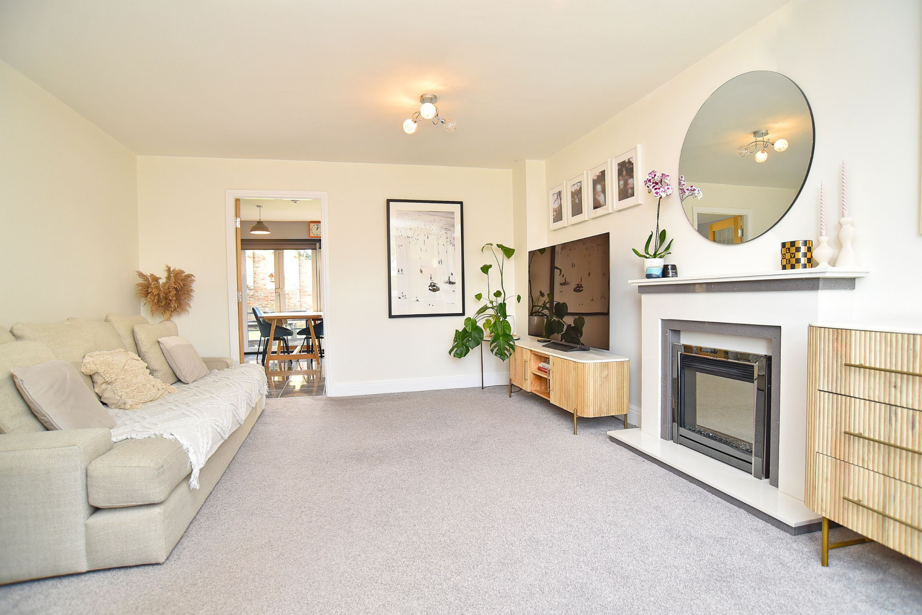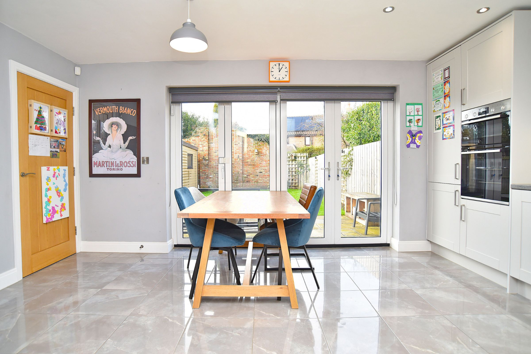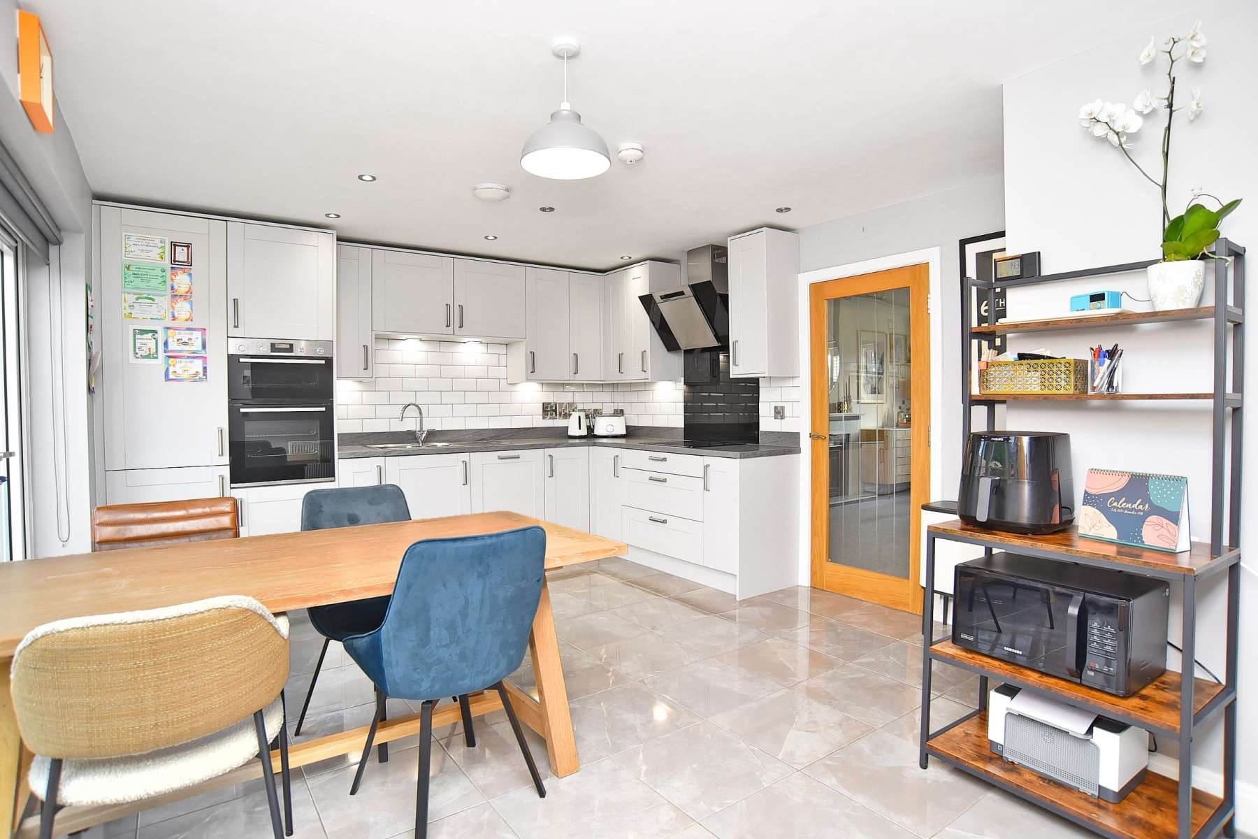 The property offers generous, intelligently planned accommodation, anchored by a striking open-plan dining kitchen appointed with high-quality integrated appliances and full-width bi-folding doors that open seamlessly onto a paved terrace-ideal for entertaining and family living. Complementing the main living space are a separate utility room, ground floor WC, and a well-proportioned living room providing a more formal retreat.