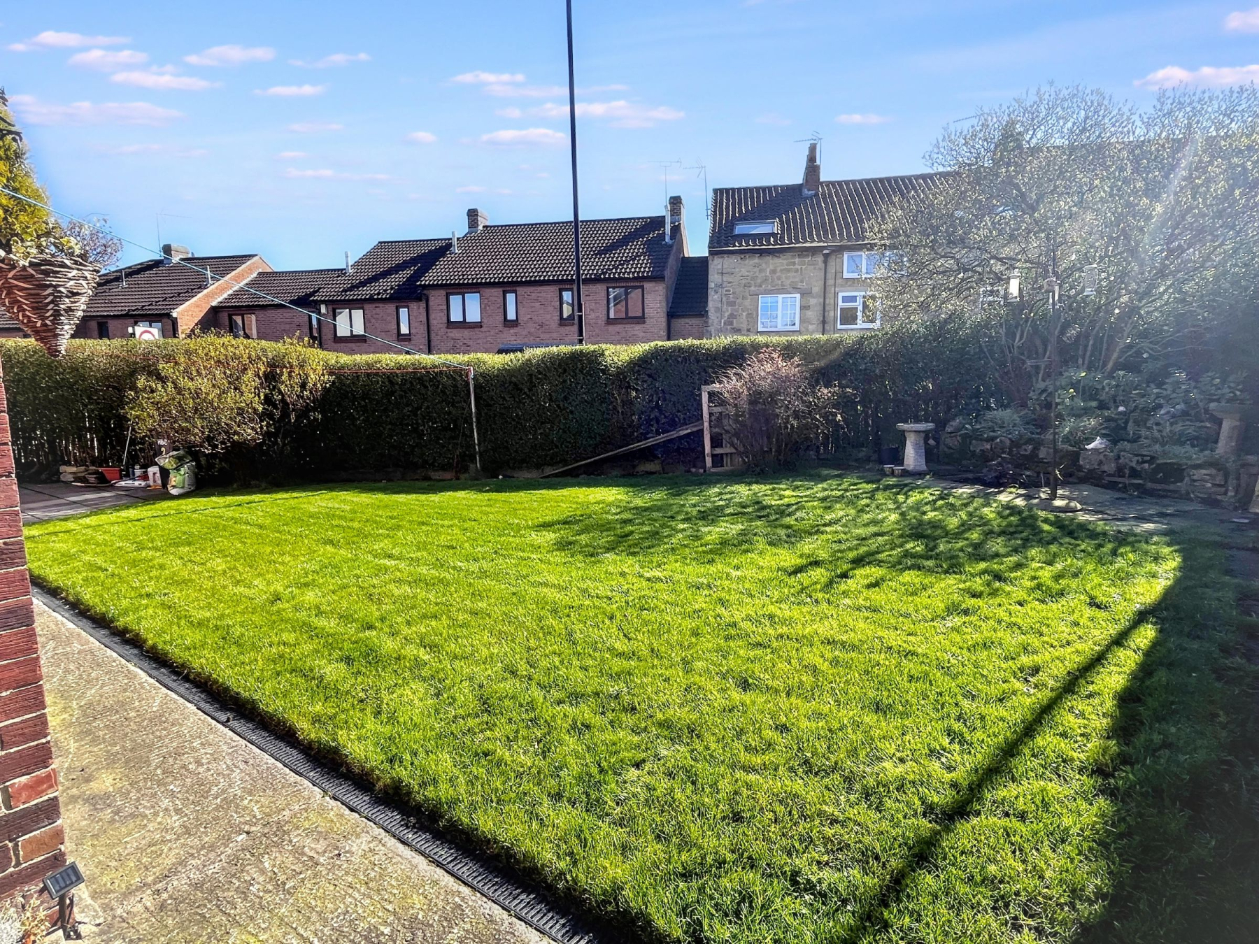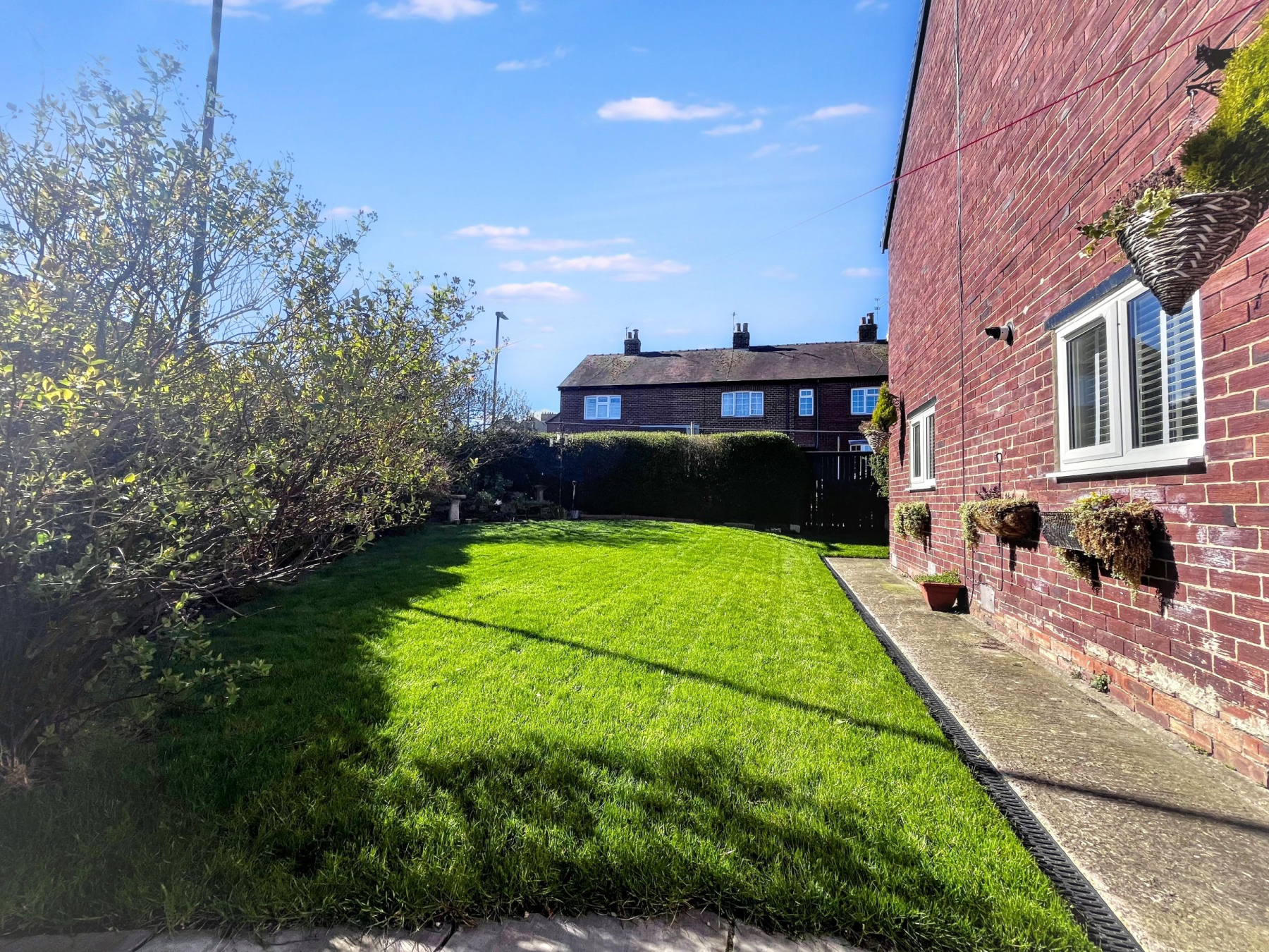 Externally, the home continues to perform strongly for family use, with wraparound gardens predominantly laid to lawn across two sides-offering ample space for children, pets, or future landscaping. A private rear patio provides additional outdoor living space, all enclosed by mature hedging and timber fencing for privacy and security.