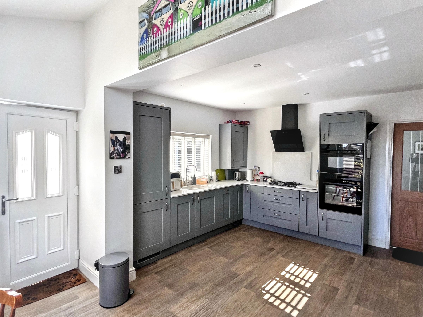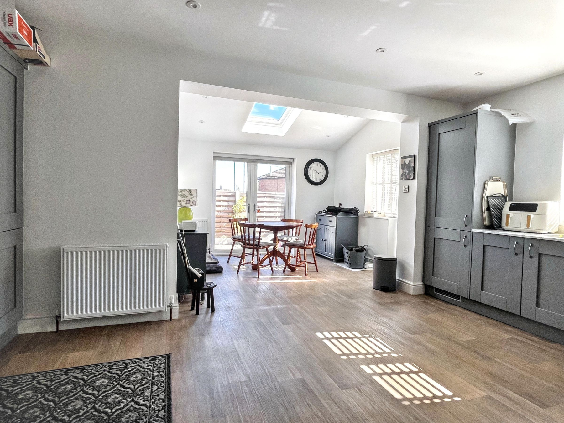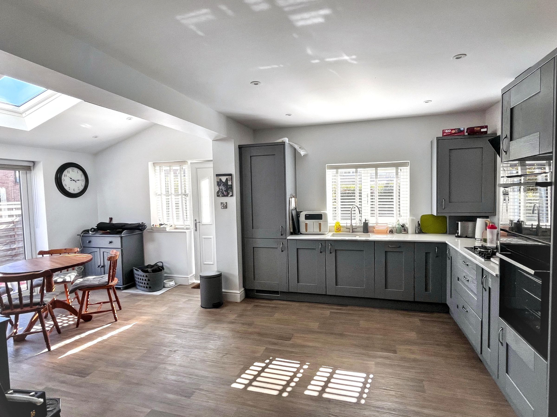 A half-glazed oak door leads into a standout kitchen-diner, installed in 2024 to a high specification. This family-focused hub benefits from integrated appliances including a dishwasher, fridge freezer, and washing machine, complemented by premium quartz worktops. French doors open directly onto a newly laid patio, providing a seamless indoor-outdoor flow-ideal for entertaining or supervising children at play.