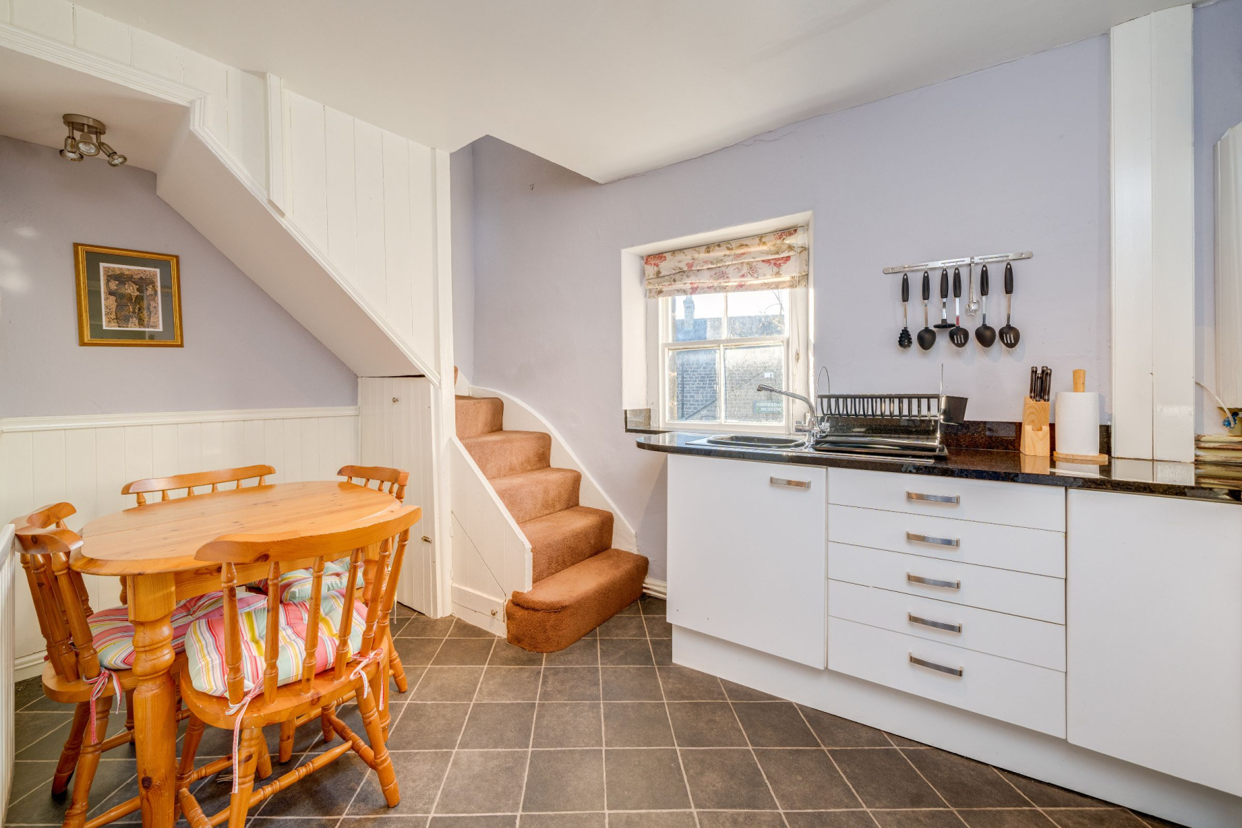The adjoining dining kitchen is thoughtfully arranged with a range of matching base units, granite work surfaces and splashbacks, along with an integrated fridge, plumbed in washing machine and space for an oven-ideal for straightforward day-to-day living.