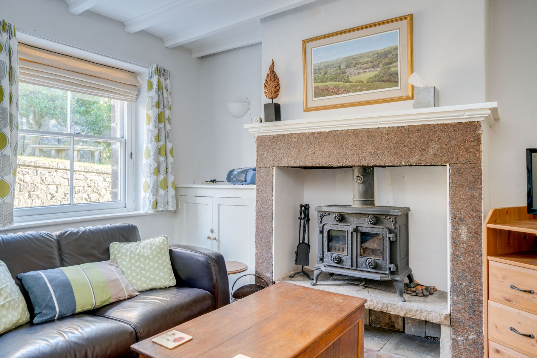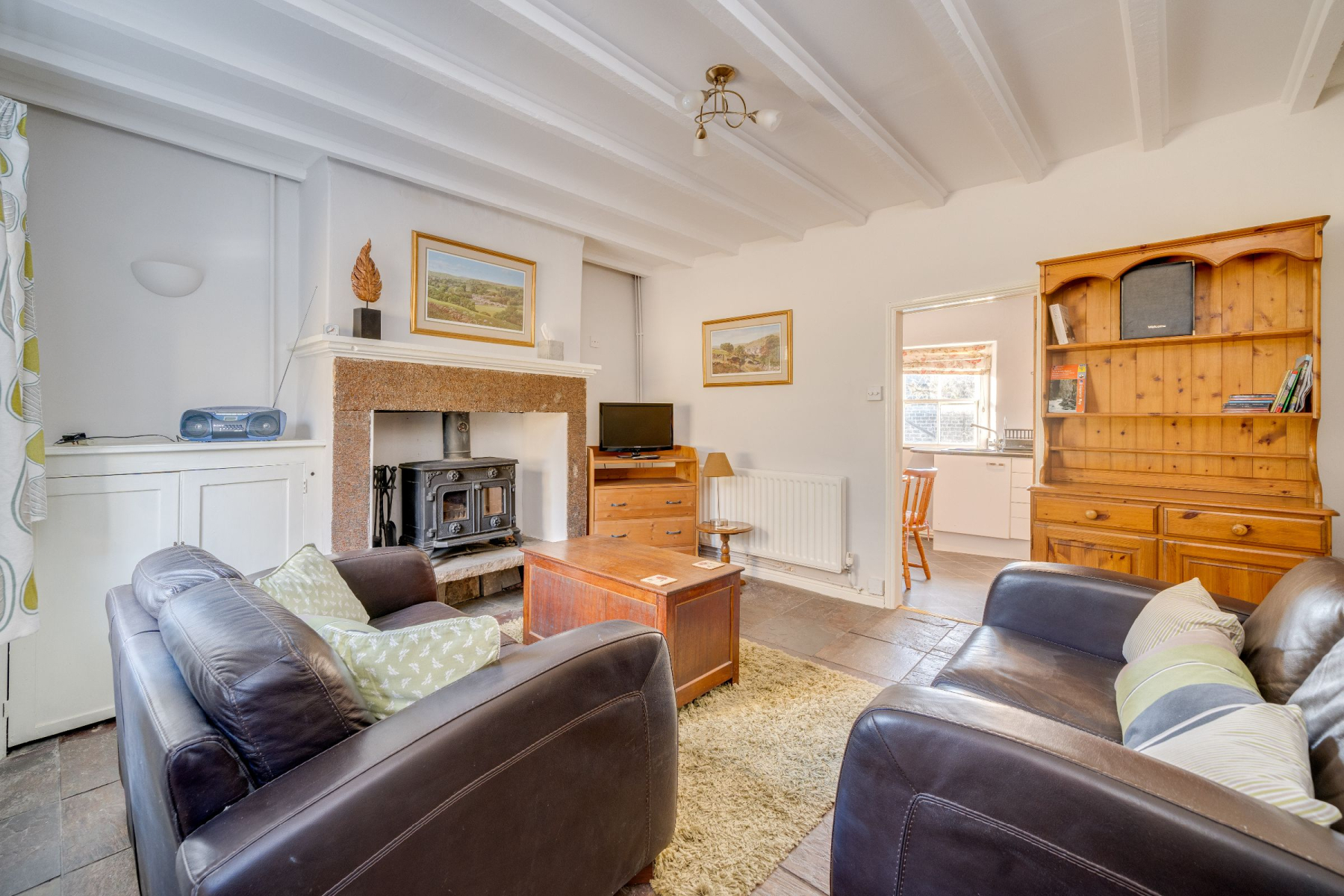 With gas central heating, a stable door opens into a welcoming sitting room featuring a raised multi-fuel stove set on a stone hearth and a painted beamed ceiling, creating a cosy and manageable living space.