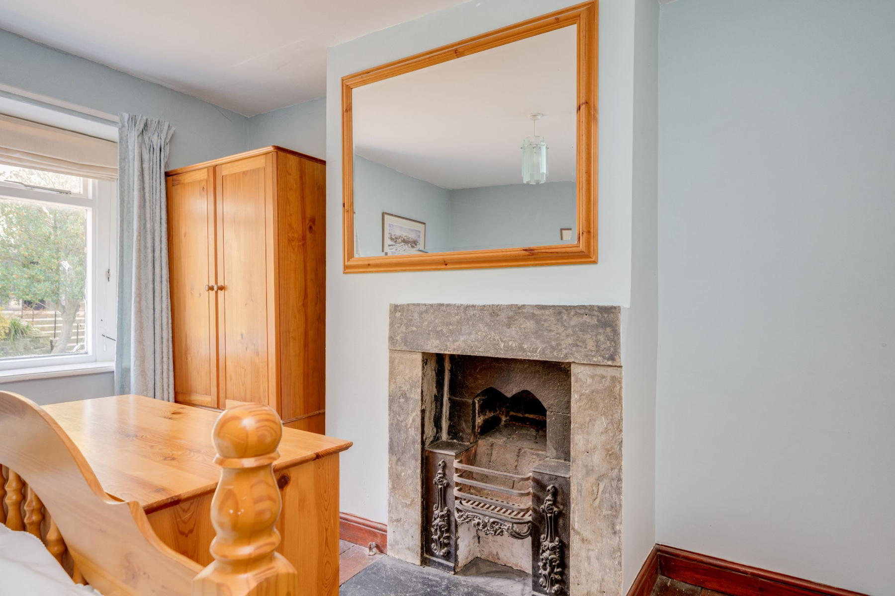 To the first floor, the double bedroom offers a comfortable retreat with feature fireplace, while the house bathroom includes a white three-piece suite comprising a panel bath with shower attachment, low flush WC and wash hand basin with storage beneath.